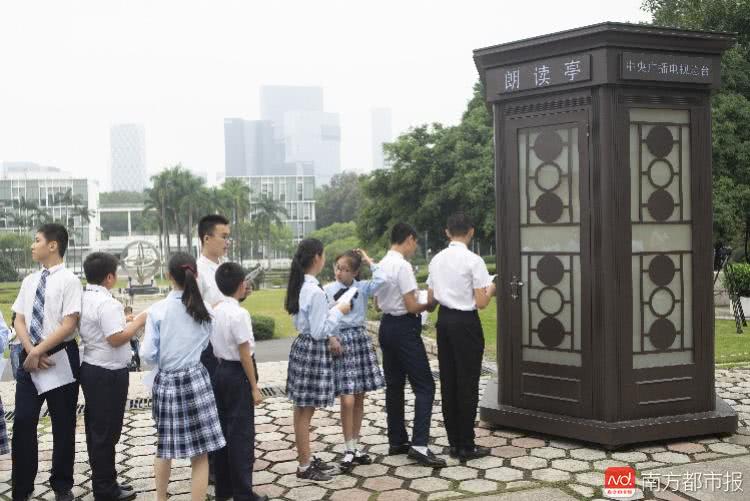 深圳外國語學(xué)校的同學(xué)來到深圳大學(xué)體驗朗讀亭,同學(xué)們在朗讀亭門外排隊。