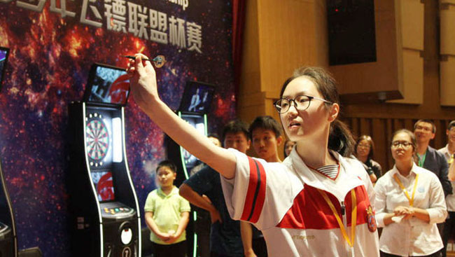 訓(xùn)練場上,57中一名女生右腿略彎支撐身體,橫向站立,側(cè)身、瞄準(zhǔn)、擲鏢,投中,順暢地完成了這一系列動作。接著第二次,第三次…… 在這間教室內(nèi),7,8臺電子飛鏢機,每個鏢靶都已經(jīng)插滿了針眼,可想訓(xùn)練之艱苦。這門選修一直吸引了很多學(xué)生參加,但是只有基礎(chǔ)的學(xué)生,練習(xí)成績過關(guān)的學(xué)生,才能成為學(xué)校運動隊一員,代表學(xué)校參加比賽。或許不久將來,在國內(nèi)外飛鏢比賽賽場上,會更多一些天賦爆棚的新生代選手。
