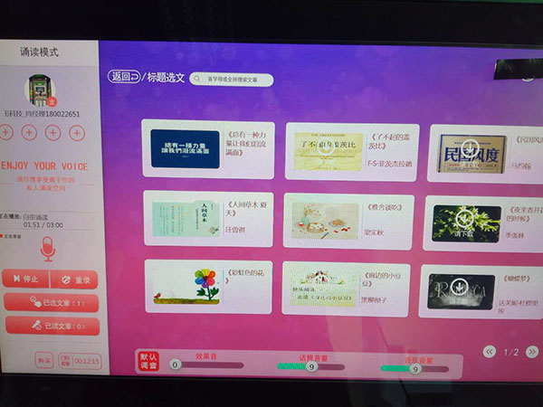校園“朗讀亭”,以朗讀體驗(yàn)方式為主,集朗讀練習(xí)、錄制、演講訓(xùn)練、閱讀為一體,并可通過微信分享自己朗讀的內(nèi)容。“朗讀亭”使用高強(qiáng)度全隔音鋼化玻璃,保證安全的同時(shí)阻隔95%的聲音,朗讀者關(guān)門后可靜享屬于自己的私密空間。朗讀亭專業(yè)定制的“朗讀亭”具有專業(yè)的錄音棚設(shè)備,頭戴式耳機(jī)和專業(yè)麥克風(fēng),可以滿足高保真音響、低噪音環(huán)境訴求,讓朗讀者在聽和朗讀的過程都輕松自然。而且,每個(gè)用戶用自己的微信賬號(hào)即可登陸,自動(dòng)錄音和及時(shí)分享。